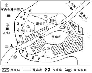 2、综合题  读“某城镇工业布局简图”回答以下问题: