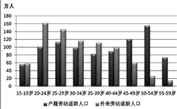 4、单选题 劳动适龄人口是指男性15~59岁,女性15~54岁的人口,读下图“2010年上海劳动适龄人口分年龄、户籍人数”统计表(同一年龄段,右侧为外来劳动适龄人口),据此图可判断