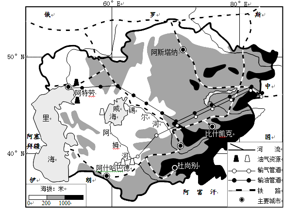 (1)该地区处于亚欧大陆内部,受海洋影响小,降水少,气候为温带大陆性气候。区域内河流多为流量小,流程短的内流河。阿姆河上游流经高山地区,高山冰雪融水为其重要补给水源。