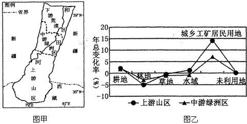 4、综合题 (l0分)和田河发源于昆仑山脉北麓,流入塔克拉玛干沙漠。图甲为和田河部分流域图,图乙为1990年-2010年和田河流域土地利用类型变化图。读图完成下列问题。