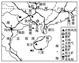 5、综合题 北部湾经济圈包括广西、广东、海南沿北部湾地区。是我国继长三角、珠三角和环渤海三大沿海经济圈后的又一沿海区域经济区。读北部湾经济区图,回答下列问题。