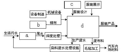 小题1:该循环系统中a、b、c、d依次为?(?) A.污水处理厂、服装生产、棉纺织、创意产业 B.棉纺织、创意产业、污水处理厂、服装生产 C.创意产业、棉纺织、服装生产、污水处理厂 D.污水处理厂、棉纺织、创意产业、服装生产