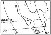 小题2:C自然带分布于30°--40°的大陆西岸,判断为亚热带常绿硬叶林带,但由于此处非洲的陆地只分布到35°S附近,故使C自然带分布的最高纬度低于35°。