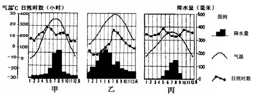 小题1:读图,北京是温带季风气候,冬季寒冷,夏季炎热,最冷月气温小于0度,降水集中在7、8两月。甲地是北京。长沙是亚热带季风气候,最冷月气温大于0度,乙是长沙。拉萨是我国夏季气温最低的地方,日照时数长,降水少,丙是拉萨。C对。A、B、D错。
