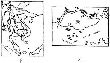 【小题1】乙图中丙国为新加坡,位于马来半岛南端,故为甲图中①位置。