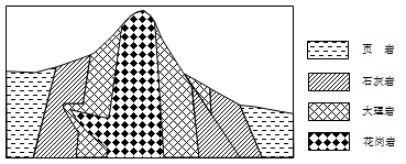 5、单选题 下图为某地区地质剖面图。地质工作者调查发现,该地区4种岩石中最古老的是石灰岩。读图,完成下列各题。