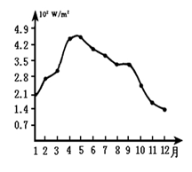 2、单选题  太阳直接辐射是指太阳以平行光线的形式直接投射到地面上。读“北京太阳直接辐射年变化图”,回答问题。