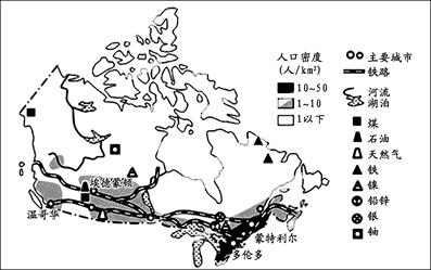 2、综合题 下图是加拿大人口、矿产等分布示意图。读图回答下列问题。