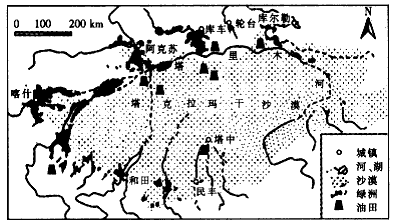 (4)指出图中绿洲分布特点,说明本区域环境承载力总体特征及其主要制约因素。