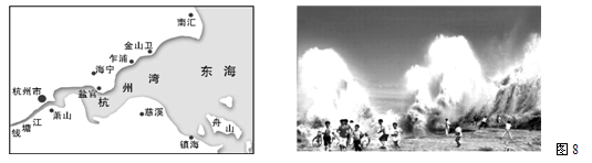 2、单选题 2007年8月2日16时30分许,杭州市发生钱塘江潮水卷人事件。读图,回答以下各题。