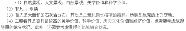 (1)根据旅游资源的本质属性分类,可将旅游资源分为自然旅游资源和人文旅游资源,云南石林、贵州荔波、重庆武隆属于自然景观。旅游资源的价值主要有美学价值、科学价值、历史文化价值、经济价值,这些景观主要体现的是其美学价值和科学价值。