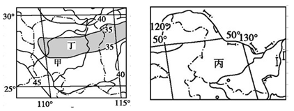 1.分析丙地发展农业生产的限制性因素是 ? 2.图中丁地带7、8月份河流径流量占全年百分比较小,其主要原因是 ?