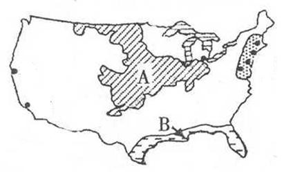 (1)图中字母A所在区域是美国著名的_______________(农业地域类型)区。该农业地域类型的突出特点有___________________、_____________________、_____________、_____________________。该类农业地域类型在我国主要分布在__________地区。(7分)