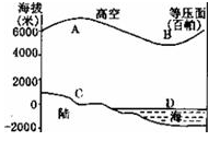 【小题1】高空中等压面弯曲方向与地面相反,根据图可知,A处等压向上凸,说明是高压,则近地面C处是低压; B处等压面向下凹,说明形成低压,则近地面D处为高压;随高度上升,气压逐渐降低,故四地气压大小为D>C>A>B。