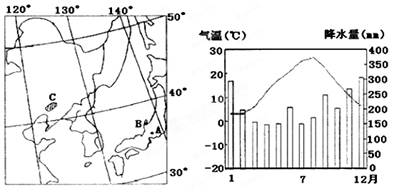 (1)右图中“降水柱状和气温曲线图”为左图A、B、C中?地的气象资料图,气候类型为?,与其它地区的该种气候类型相比,该地?性强,具体表现为:(6分)