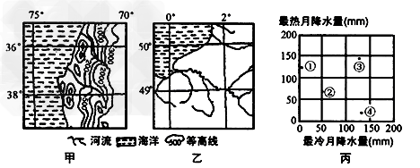(1 )丙图中的点,反映甲图沿岸地区气候的是______________?,反映乙图所在地区气候的是____________。(写序号)