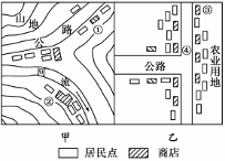 1.①②③④四个聚落中最有可能发展成为商业中心的是2.甲图中商业网点的密度小于乙图,因为甲图