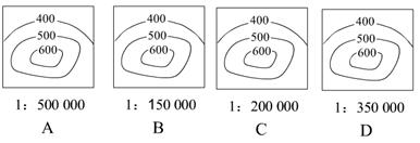 小题1:四幅图图幅相同、等高距相等、等高线疏密程度相同,比例尺越大,表示的实际水平距离就越小,坡度就越大。