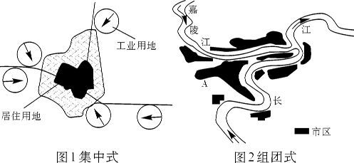 本题解析:西宁地处湟水谷地,城市形态呈条带状,受狭窄谷地的限制,城市的服务范围沿河谷拉长。兰州沿黄河两岸延伸,与西宁一样同属条带式。 点评:本题难度较小,城市形态与城市所处的地理环境(地形、河流、交通线等)关系密切,结合区域实际及所学知识不难作答。 知识小结:城市形态类型   城市形态是指城市所占据一定空间的外部轮廓形状,反映城市平面分布状况。城市形态与城市所处的地理环境(地形、河流、交通线等)关系密切。 城市形 态类型 集中式(图1成都) 分散发展式 组团式(图2重庆) 条带式(图3兰州)或放射状(延安) 成因 地形:完整开阔的平原地形 地形、河流:地形崎岖不平、河汊纵横交错 受地形、河流、交通条件的影响,依山傍水 优点 便于集中设置较完善的服务设施,便于行政领导和管理,节省建设投资 分散生产,分散管理,环境污染较小 各部分接近郊区,近自然,环境污染小 不足 环境污染也相对集中 用地分散,联系不便,不便于行政管理,市政建设投资大