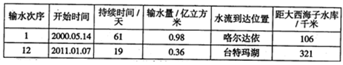 【小题2】根据表格数据,第12次输水每日的输水量大,说明速度快,①对。干旱区,植物吸收不会减少,②错。流速快,下渗减弱,③对。蒸发状况差别不大,④错。农业生产截留少,⑤对。所以D对。