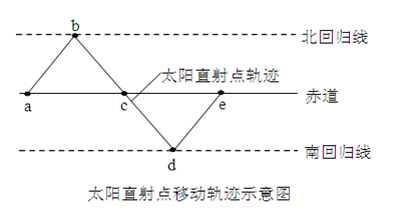 小题2:根据正午太阳高度=90°-纬度差,故当南北回归线上正午太阳高度相等时,即两地距离太阳直射点的距离相等,太阳直射点位于赤道。即a、c、e位置。