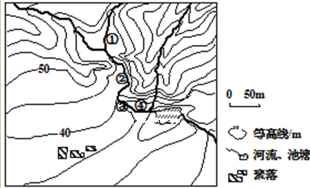 小题3:水库选址要找内部容量大,出口狭小的口袋型洼地,①处地形正适合,且有一个峡谷出口,是建坝的地点。根据峡谷处的等高线数值,最低点海拔40-45米,坝高13米,至少要连接到峡谷两侧55米等高线。根据图上比例尺,可知连线长度小于50米(测量准确的话能更接近正确答案数值),选项中只有B最接近。所以B对。A、C、D错。