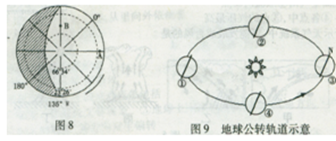 (4)图8所示日期,在图9中地球位于?(填序号)位置。此时,地球的公转速度较?(快、慢)。