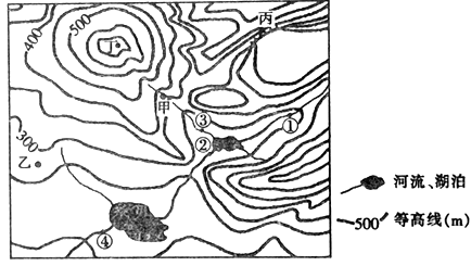 【小题2】某校地理研究性学习小组,利用暑假调查该区域进行野外地理考察,甲、乙、丙、丁四地中适合成为宿营地的是