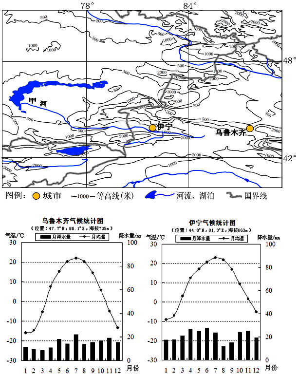 材料二:图乙是图甲中我国两城市伊宁(海拔663米)和乌鲁木齐(海拔735米)降水柱状图和气温变化曲线图