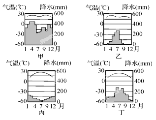 【小题2】据图可知,M点位于南纬10°~20°之间大陆西岸,故应该为热带草原气候。图中甲为热带雨林气候,乙为热带草原气候,丙为地中海气候,丁为温带海洋性气候。