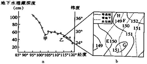 小题2:读右图,实线是等高线,虚线是等地下水位线,图中数据都是海拔高度,根据图中的数值判断甲地的地下水位埋藏深度。E地等高线数值149-150米之间,地下水位的海拔是149-150之间,埋藏深度是0-1米之间,小于1米,结合表格中数据,根部能到达地下水位,①植物在E区可以良好生长,选项A对。F地等高线范围是151-152米,地下水位是149-150米,地下水位埋藏深度是1-3米,结合表格数据,根不一定能达到地下水位,不适宜种植,选项B错。同理可以判断③植物在F区能成活,选项C错。④植物在H区不会因为缺水而死亡,选项D错。