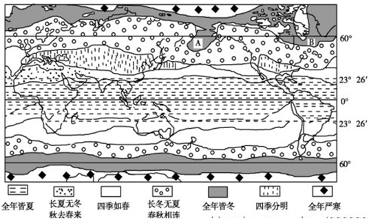 3、单选题 月均温在20℃以上可称高温;月均温在10℃~20℃之间,可称温暖或暖热;月均温在0℃~10℃之间可称凉爽或温和;月均温在0℃以下则称寒冷或严寒等。而描述降水多少则要复杂一些。因为一个地方的干湿状况与气温、蒸发量有密切的关系。下图为按连续五日平均气温划分的“世界四季类型分布图”,读图回答以下问题。