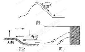 1.图1显示的是沿海山地迎风坡成云致雨的过程,这种降水类型称为2.图2显示的是某一自然地理现象的循环过程,该过程为3.图3中的阴影部分代表大陆,另一部分代表海洋,图中等值线表示