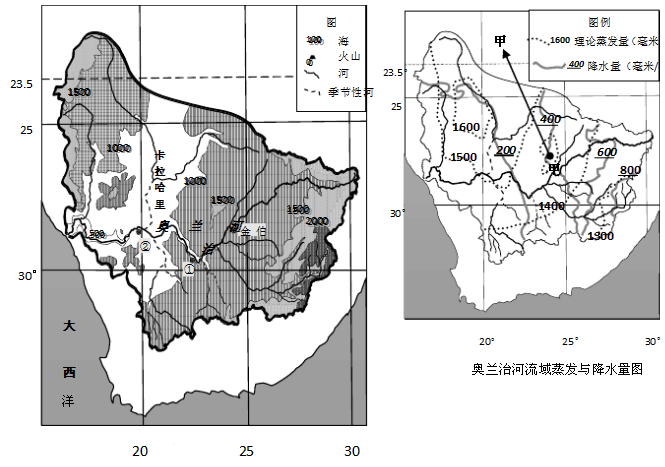 材料 奥兰治河(Orange River)是南非径流量最大的河流,长2200公里,流域面积97万多平方公里。其干流上的①地径流量是106.12亿立方米/年,②地径流量是105.83亿立方米/年。流域内矿产资源丰富,在金伯利附近死火山通道中发现了金刚石原生矿,并在奥兰治河入海口发现了规模大、品位高的金刚石砂。