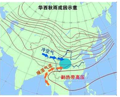 每年进入9月以后,华西地区在5500米上空处在西北太平洋副热带高压和伊朗高压之间的低气压区内。西北太平洋副热带高压西侧或西北侧的西南气流将南海和印度洋上的暖湿空气源源不断地输送到这一带地区,使这一带地区具备了比较丰沛的水汽条件。同时随着冷空气不断从高原北侧东移或从我国东部地区向西部地区倒灌,冷暖空气在我国西部地区频频交汇,于是便形成了华西秋雨。因此A正确。