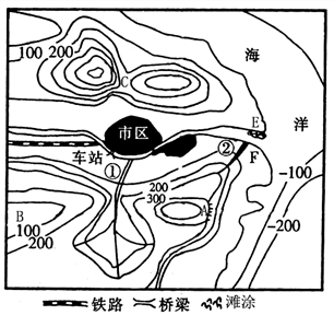 (4)F(1分);该地区没有铁矿资源,要建立钢铁联合企业,铁矿需要海运进口,F地处于河流侵蚀岸,港阔水深(1分)