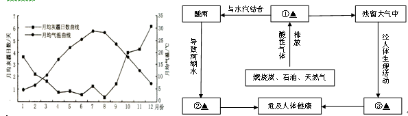 灰霾是大量极细微的固体物质悬浮在空气中,造成空气浑浊的天气现象。2013年初我国中东部地区灰霾天气的产生与燃烧煤、石油、天然气等化石能源密切相关。读我国南方某工业城市近年来月均灰霾天数与月均气温的年变化示意图,回答下列问题。
