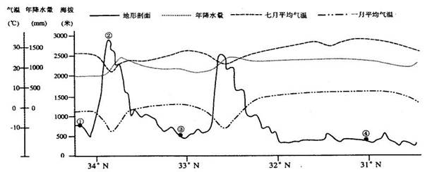 【小题1】从图中找出②山地附近的年降水量线,在最大降水量处做垂线,与地形剖面图有交点,再读出交点的海拔,为南坡大约2200米处。