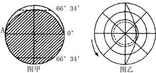 (5)图乙是图甲的北极俯视图。请在图乙上:①绘出飞机的路径(用箭头表示),并注明起飞处E和降落处F;②用阴影表示出夜的范围。