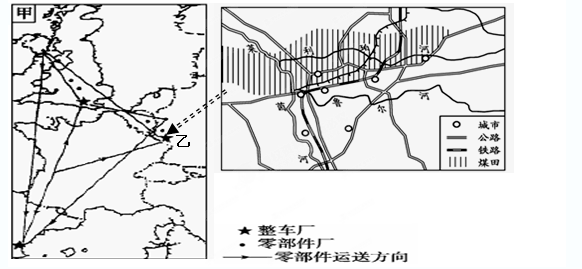 4、综合题 美国某汽车公司在欧洲建有一种小桥车的多个零部件厂和3个整车厂,甲图是该小桥车的生产联系网络示意图。读材料及图回答问题。