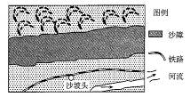 ①产业结构的差异?②资源分布的差异?③距海远近的差异?④开放程度的差异 A.①④?B.③④? C.①③?D.②④ 小题3:我国推动东、西部协调发展,采取的主要措施是( ? ) ①给予西部大量的财政补贴?②增加对西部基础设施的投资? ③保护西部的工业产品不受外部产品的冲击?④发挥地区优势,积极引进人才 A.①②?B.③④? C.①③? D.②④ 小题4:为了加强三个经济地带的互补与合作,应从东部地带向中西部转移的工业类型是: ①劳动密集型?②资金密集型?③资源密集型?④?技术密集型 A . ①②③? B ①③? C ②④? D ①②④ 小题5:制约西部经济发展最重要的经济原因是( ? ) A.资金、技术、人才匮乏?B.农业基础薄弱 C.水土流失严重?D.自然资源不足 4、单选题  为了防御流沙侵袭,科研人员利用稻草、芦苇、麦秸等材料,在宁夏中卫沙坡头铁路沿线的流动沙丘上扎设方格状挡风墙,植树造林,建造一条宽500~600米,长16千米的带状沙障(如图)。据此回答16~17题: |