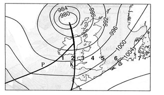 5、单选题 读8月份中纬度某地区海平面等压线图,回答问题。