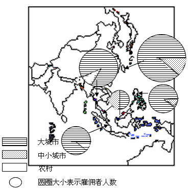1、综合题 下图表示设在亚洲地区的日本企业的用人规模图,读图回答。