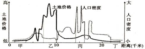 本题解析:由图可知:甲区人口密度小,低价较低,离市中心较远,适合工业区布局,故A错;乙区土地价格高,商业活动的付租能力最强,该区以商业活动为主,故B错;丙区住宅用地为主,人口密度大,C正确;丁区土地价格低,离市中心最远,交通通达度肯定较差,不适合布局商业区。