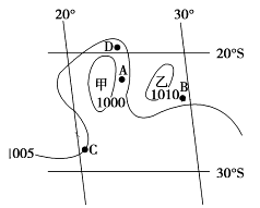 (1)由图中数据可以看出甲地向外围气压数值越来越高,为低压中心,乙地向外围气压数值越来越低,为高压中心。