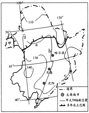 5、单选题 下图为我国东北地区年太阳辐射总量(单位:千卡/平方厘米·年)与多年冻土范围分布图,读图回答1~2题。