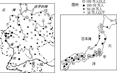 4、综合题 读德国和日本不同等级城市分布图,完成下列要求。