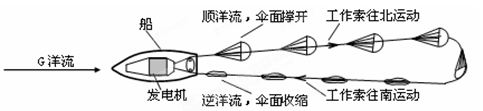 A.洋流①对欧洲西部气候降温减湿作用明显 B.洋流②对南美洲西岸气候增温增湿明显 C.P处因寒暖流交汇形成世界性大渔场 D.美国东岸海域污染物不会影响欧洲西岸海域 3、单选题 伞式洋流发电是通过“伞”带动工作索周而复始地运动,进而带动发电机运转发电。读下图(美国本土南部附近海域的伞式洋流发电站示意图),完成第问题。 4、单选题 英国海军军官加文·孟席斯所著《1421:中国发现世界》认为,中国人最早绘制了世界海图,郑和船队早于哥伦布70年到达美洲大陆,早于库克船长350年发现澳洲与南极洲。下图是他根据史料绘制的洪保将军(郑和属下)船队的航线示意图。读图回答下列各题。 |