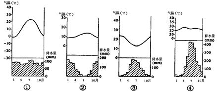 本题解析:本题主要考查气候类型。根据四地的气温、降水分布状况,判断①表示温带季风气候(最低月温低于0°,夏季降水略多)。②表示地中海气候(雨热不同期)。③表示南半球的地中海气候(雨热不同期)。④表示热带季风气候。