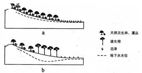 原产澳大利亚东北部热带雨林中的几种高大按树,主根深扎地下,能大量吸收地下水·这几种桉树适应性强,生长迅速,3-5年即可成材,统称“速生桉”,.我国西南地区某地引种速生桉作为造纸原料。图中a、b分别示意该地速生桉种植前、后的变化。